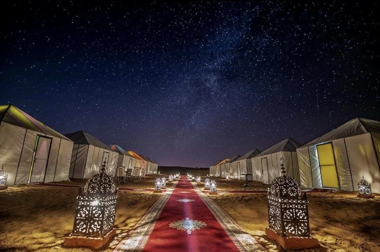 Luxury desert camp experience with live Berber music, firelight, and private tents under the stars