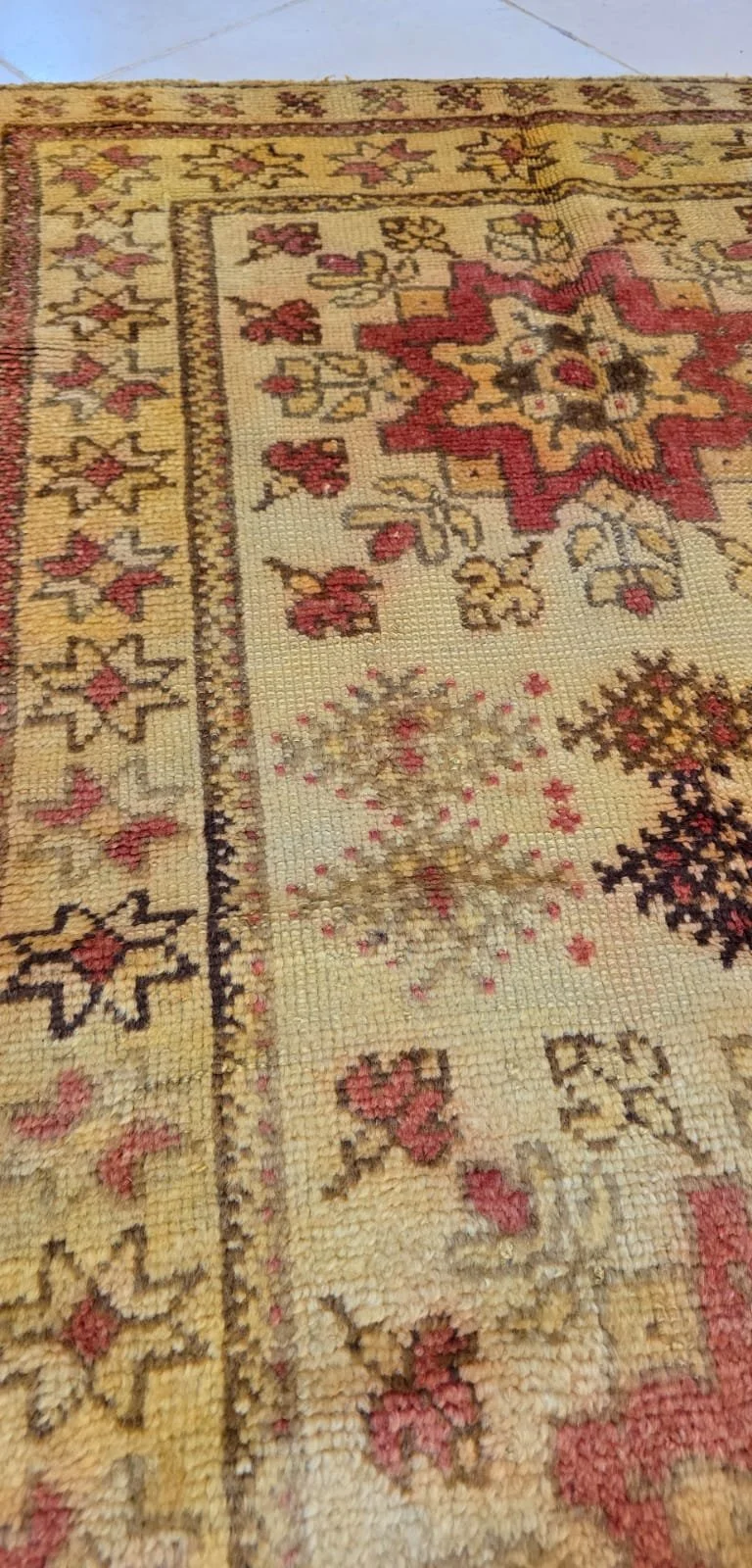 The palette is equally compelling. Golden hues dominate the field, enriched by rose, brown, and muted red tones derived from natural dyes and undyed wool. The surface has developed a soft patina through age, giving the rug depth, warmth, and a quiet luminosity that cannot be replicated.