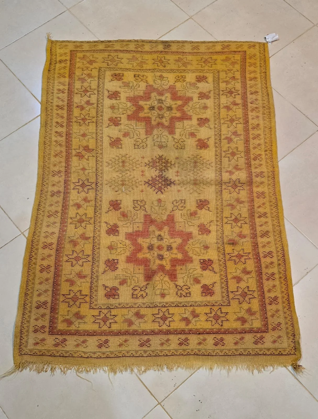 Antique Amazigh Carpet – Golden Moroccan Wool Rug – Symbolic Tribal Art with Rub el Hizb & Protective Motifs – 4.6 x 3.2 ft