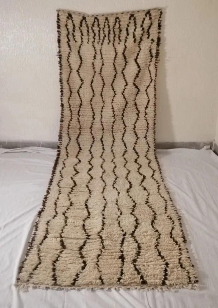 Vintage Beni Ourain Runner – Handmade Moroccan Wool Carpet – Cream and Chocolate Zigzag River Design – 10 x 3 ft