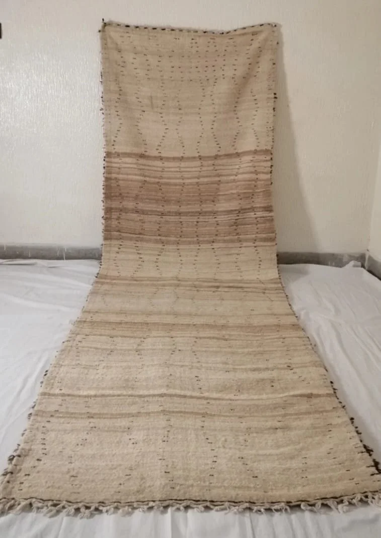 This runner features a soft cream field with a chocolate brown zigzag motif often referred to as a “river” design. The line moves fluidly across the surface, creating a sense of motion while maintaining a calm, balanced composition. Designs like this are not random. They reflect interpretations of landscape, movement, and continuity, translated through a visual language passed down through generations.